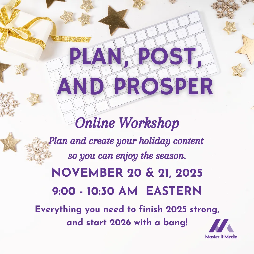 By the end of these two sessions, you’ll have your December posts planned, created, and scheduled—so you can focus on your business, your family, and a little holiday cheer.