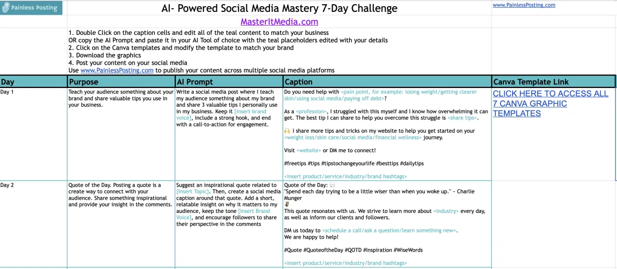 📊 Google Sheet Organizer: A ready-to-use Google Sheet that lays out your daily AI prompts, captions, and Canva template links so you can keep everything organized in one place.